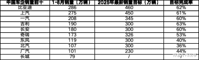 从今年1-8月份销量前十的中国车企数据来看,行业头部阵营格局清晰。比亚迪以 286 万辆的累计销量稳居榜首,在25年度460万辆最新销量目标中完成率达 62%,在新能源赛道持续领跑;吉利汽车表现亮眼,190 万辆的销量实现 300 万辆年度目标的 63%,完成率位列前十车企首位;上汽、一汽、长安分别以 275 万辆、208 万辆、180 万辆销量,达成各自年度最新销量目标的 61%、60%、60%,凭借全品类布局与新能源产品落地,维持规模优势。