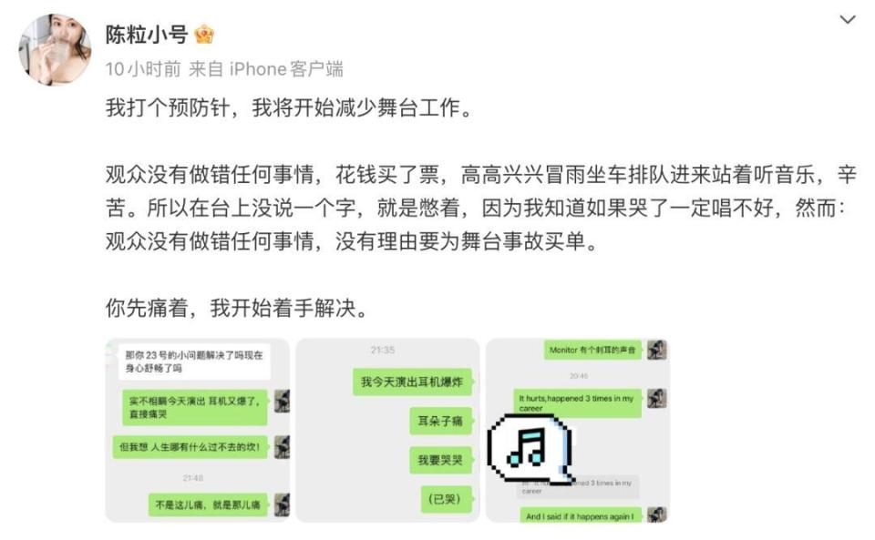据陈粒晒出的聊天记录显示,她表示此类事故已发生过3次,而自己说过,如果耳机再发生这样的事情将“退休”。