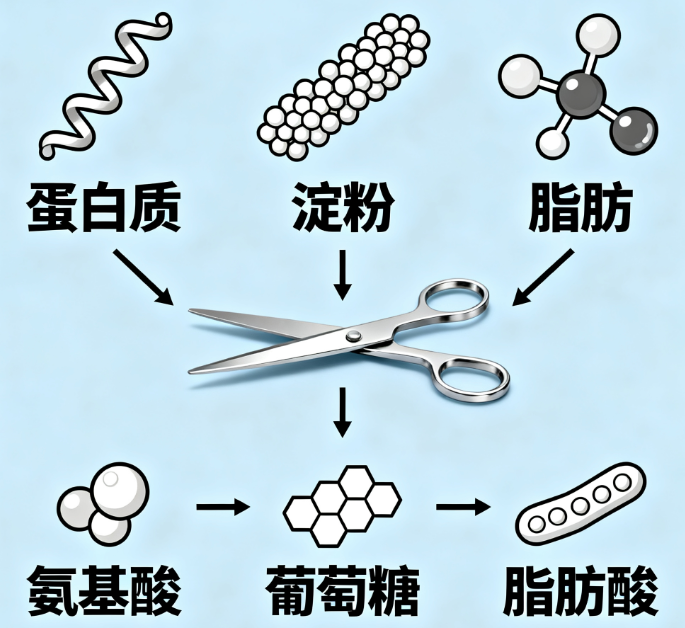 首先要明确的是,“酶能分解食物” 并非商家噱头,而是被生物学证实的基础原理。我们的身体每天都会分泌消化酶(如蛋白酶、淀粉酶),将吃进去的蛋白质、淀粉、脂肪等大分子食物,分解成能被小肠吸收的小分子营养(如氨基酸、葡萄糖)。