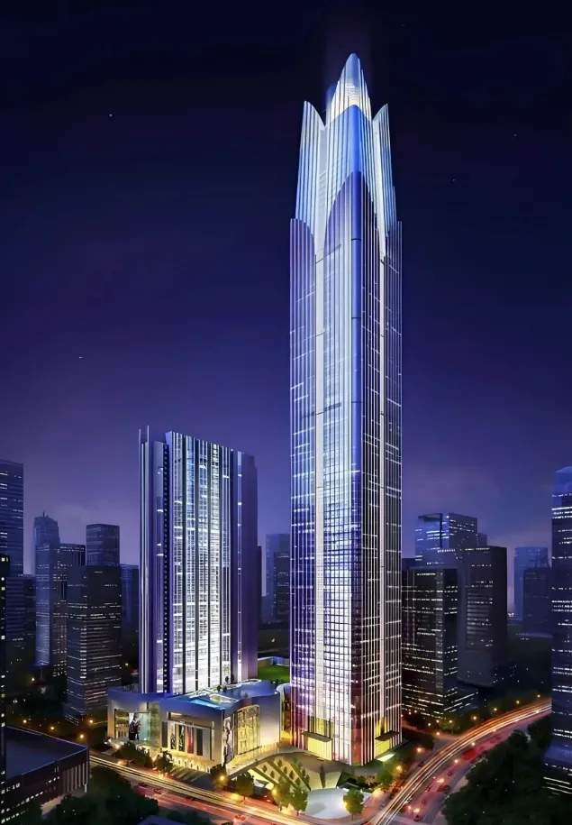 顶部塔冠采用多面切割设计,宛若悬浮于空中的水晶,每当夜幕降临、灯光亮起,轮廓格外分明,成为南宁夜景中一抹璀璨的亮点。
