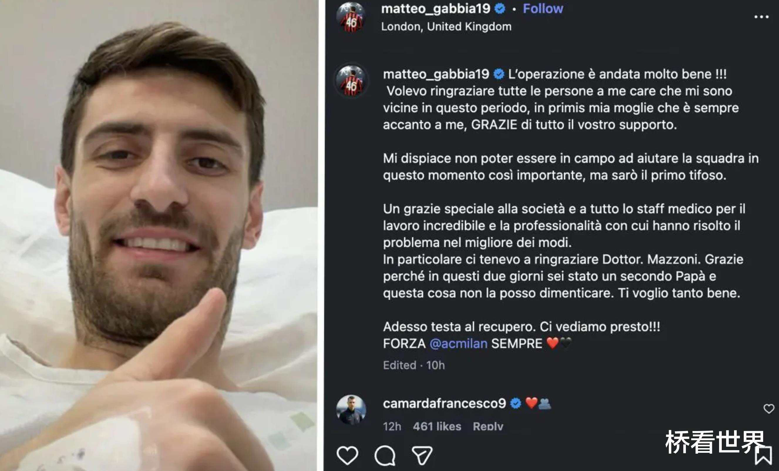 【马泰奥·加比亚接受手术,在社交媒体上发布了一则动态】