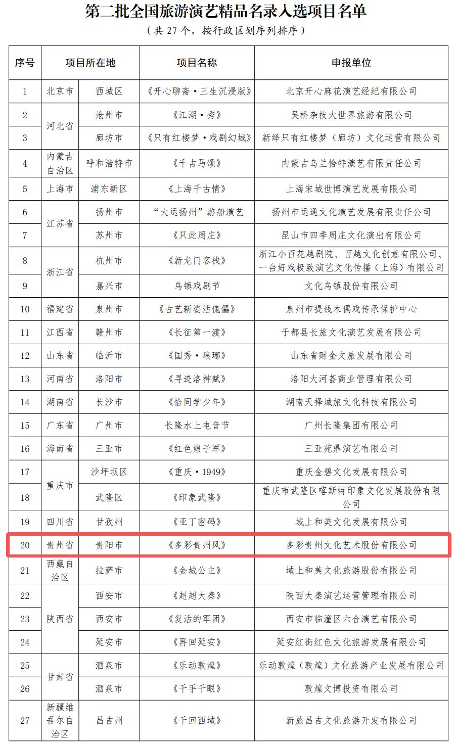 1月15日,文化和旅游部官网发布了《文化和旅游部办公厅关于公布第二批全国旅游演艺精品名录入选项目名单的通知》,其中多彩贵州文化公司的《多彩贵州风》大型民族歌舞演出作为贵州省唯一的旅游演艺项目成功入选,与全国27个项目一道成功跻身这一国家级精品名录,展现了贵州省持续推进“以文塑旅、以旅彰文”文旅融合发展的优秀成果。