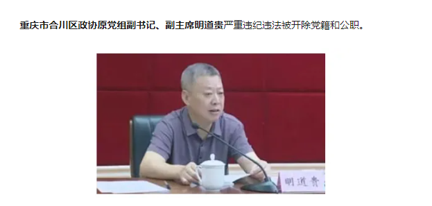 甲辰年(2024年)秋,辞去副主席职。越一载,乙巳年(2025年)九月,重庆市纪委监委通报骤至:此深耕合川三十六载之“本土派”明道贵,竟“涉嫌严重违纪违法”,接受审查调查。至丙午年(2026年)四月,查实其“丧失理想信念,背弃初心使命,对党不忠诚不老实,对抗组织审查;无视中央八项规定精神,违规接受宴请并收受礼品、礼金;无视组织原则,在干部选拔任用、岗位调整工作中为他人谋利并收受财物;廉洁底线失守,通过民间借贷获取大额回报,违规从事营利活动;违规干预和插手司法、执法活动”,遂被开除党籍、开除公职,所谓“双开”。