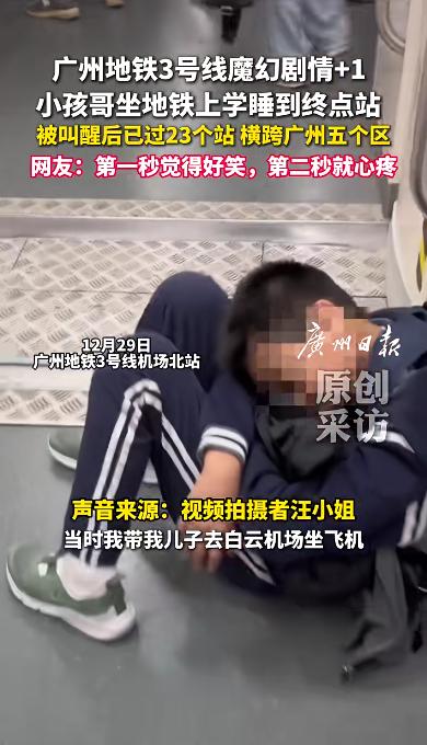 据视频拍摄者汪女士介绍,12月29日,她乘坐地铁3号线前往白云机场赶飞机。当列车到达终点站机场北站时,她发现这名小学生仍坐在车厢过道上熟睡。汪女士见状好心将其叫醒,询问后得知,孩子原本要在汉溪长隆站下车去上学,却因熟睡错过了站点,整整坐过了23站。在长达一个多小时的睡眠中,地铁载着他横跨了广州五个区,最终抵达机场。
