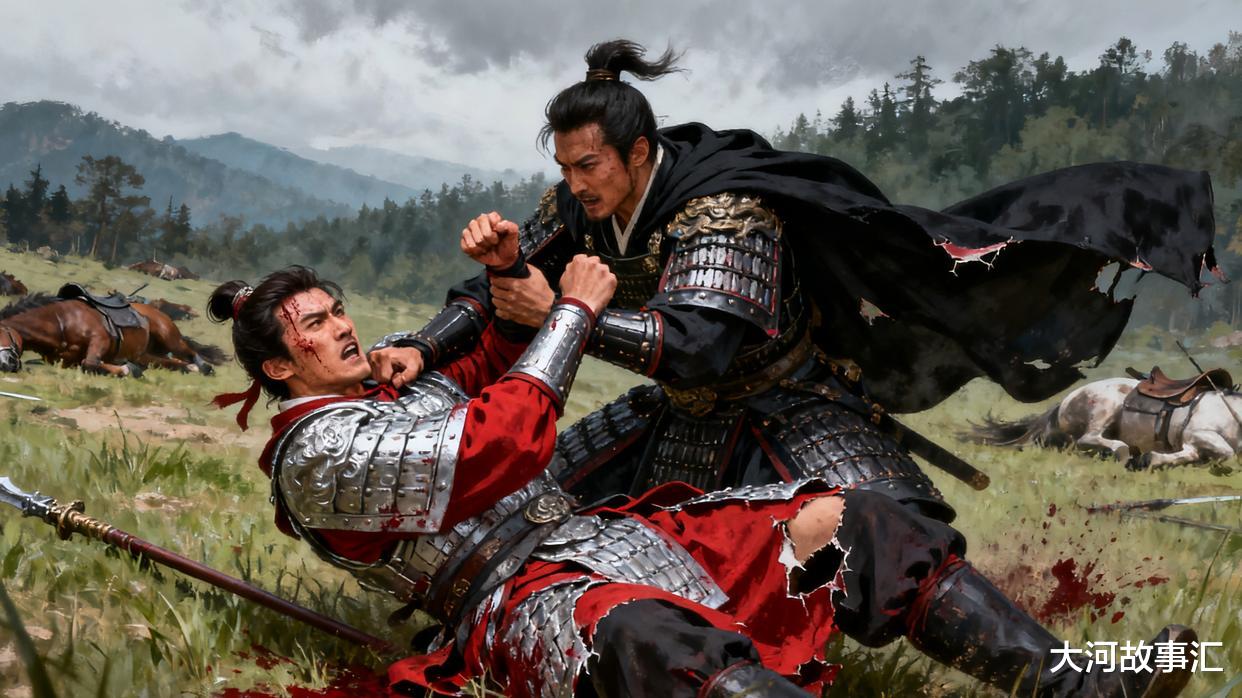 双枪交错,火星四溅。战五十合不分胜负,二人滚落马下,弃枪厮打。战袍撕裂,血染荒草,犹自擒抱扭打。