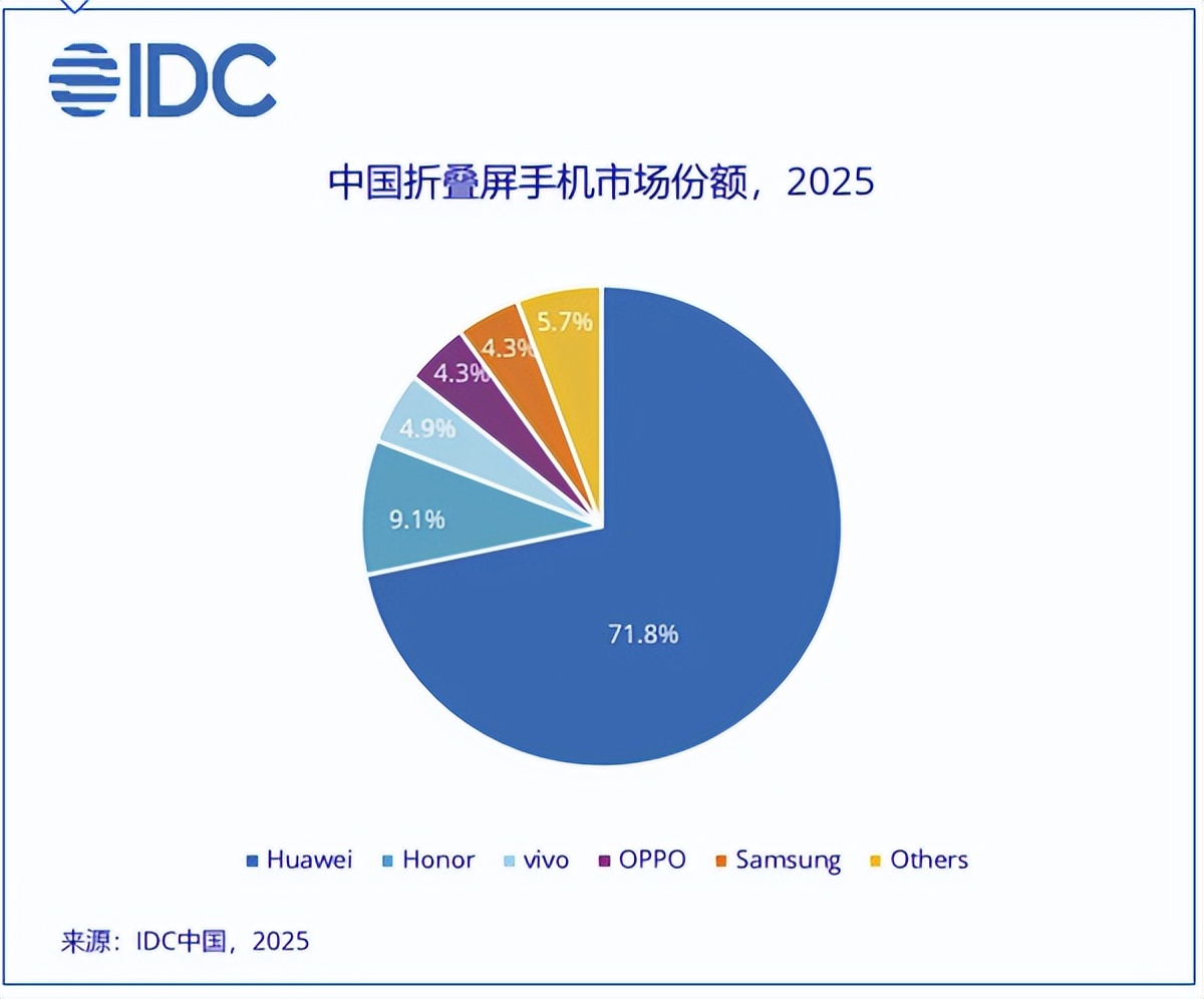 正是这种“全形态布局”,让华为牢牢坐稳折叠屏市场销量第一、口碑第一的宝座。2025年,IDC数据显示华为折叠屏全年市场份额达71.8%,实现断层式领先。这已是华为连续七年稳居第一,也让众多消费者形成了“折叠屏就买华为”的共识。