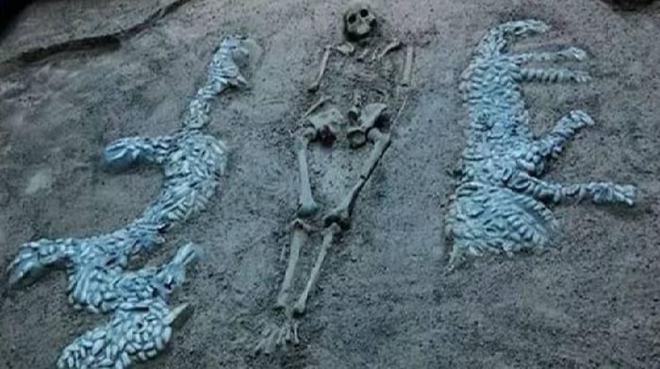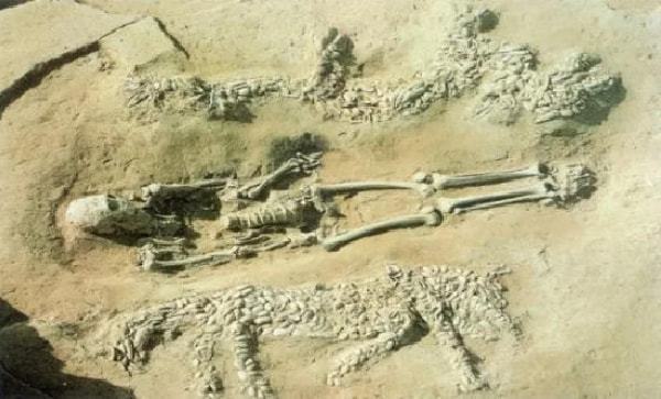 这次出土的一个墓室中,有一具壮年男性的骨架,骨骼左右两侧,有用蚌壳精心摆塑的龙虎图案。龙图案身长1.78米,高0.67米,昂首、弓身、长尾,前爪扒、后爪蹬,状若腾飞。