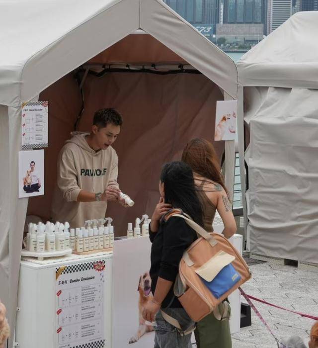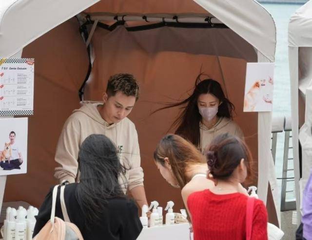 二人在现场可以说是相当抢眼,他们以情侣装上阵,二人有默契地分工,何广沛充当活招牌在档位前售卖,而女友Sarah更多的是负责一些背后的工作,再加上有爱犬的助阵,从现场的照片中可以看到二人的摊位还是很热闹的。