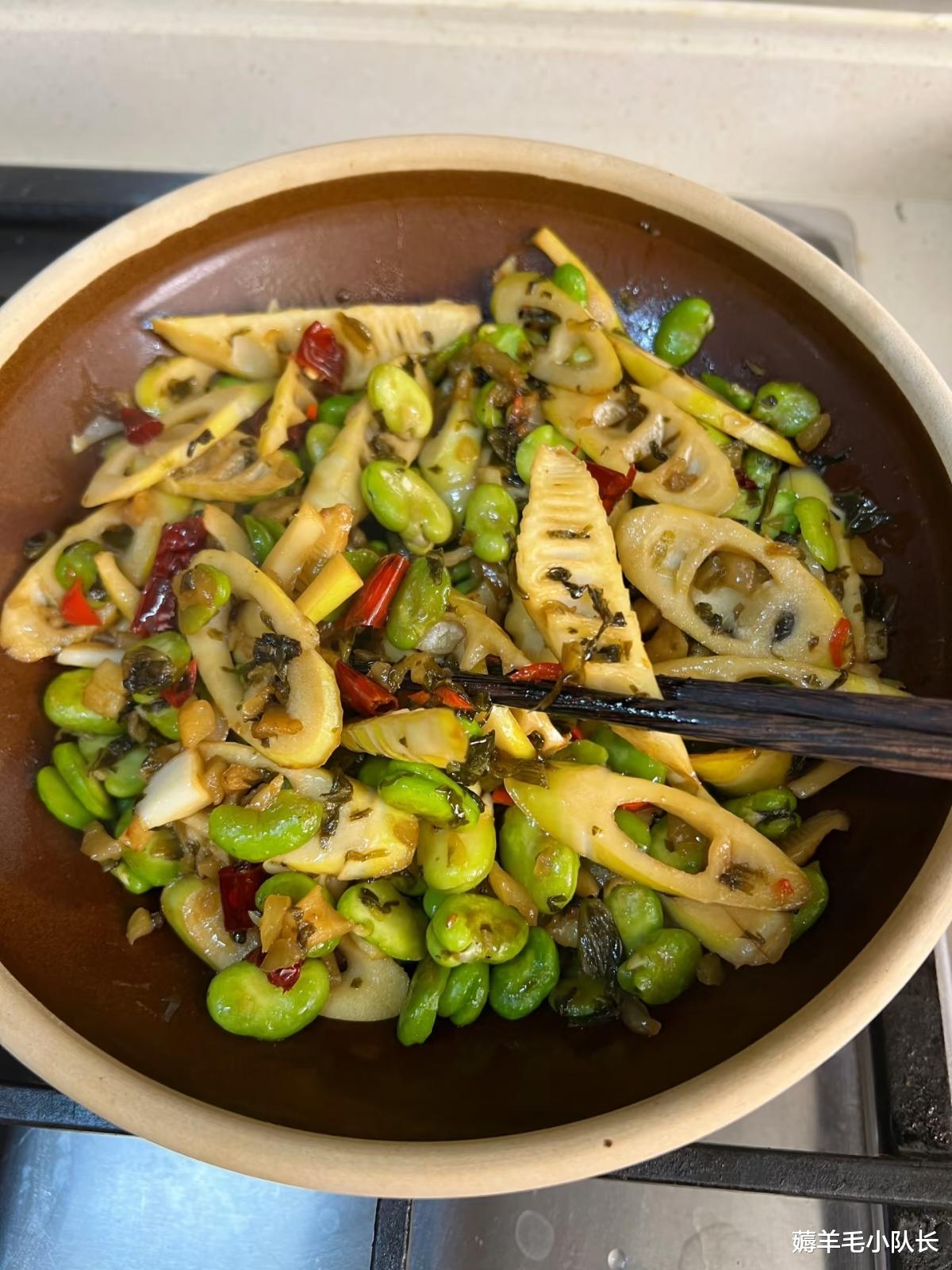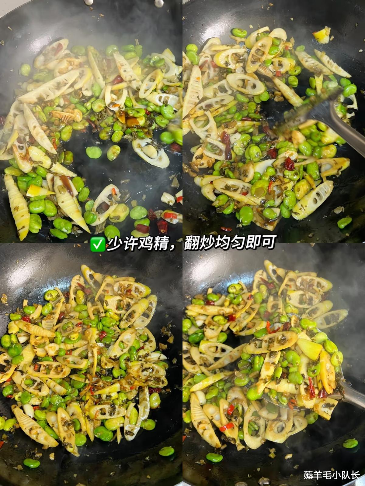 然后,倒入沥干水分的春笋,再加入酸菜和辣椒。这几种食材一相遇,仿佛奏响了一曲春日美食乐章。快速翻炒两分钟,在这两分钟里,能看到春笋、蚕豆、酸菜和辣椒相互交融,各种香味也开始相互渗透。酸菜的酸、春笋的鲜、蚕豆的糯,还有辣椒的辣,都在这翻炒中逐渐融合。