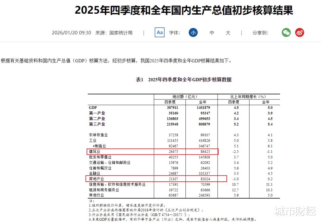 国家统计局数据显示,2020年房地产业+建筑业增加值占GDP比重达到历史峰值的14.5%,2025年这一占比数据降至12.08%。