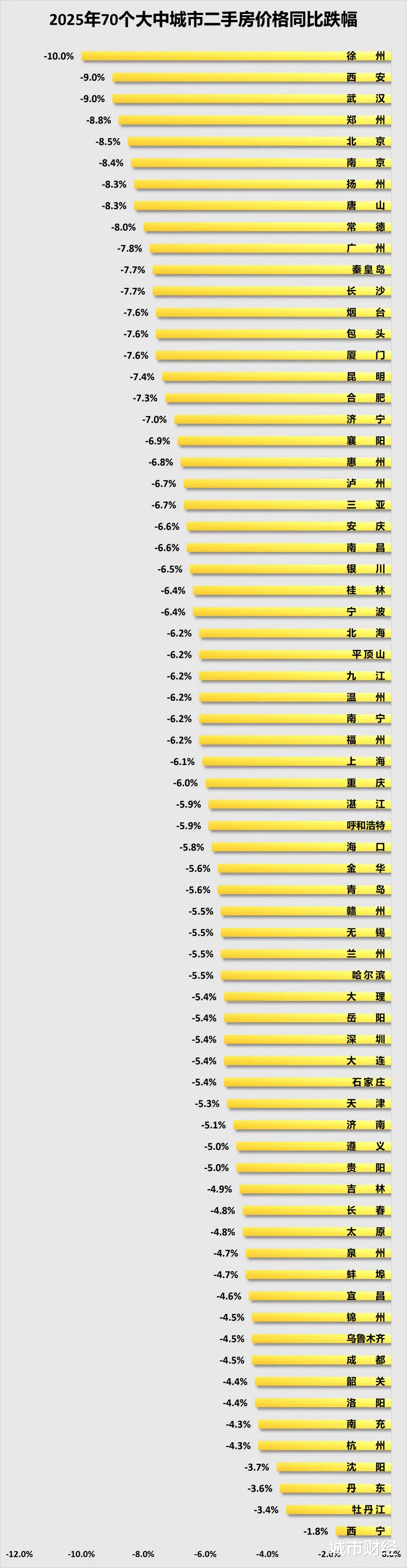 其中徐州跌幅第一,且是唯一一个两位数下跌的城市。