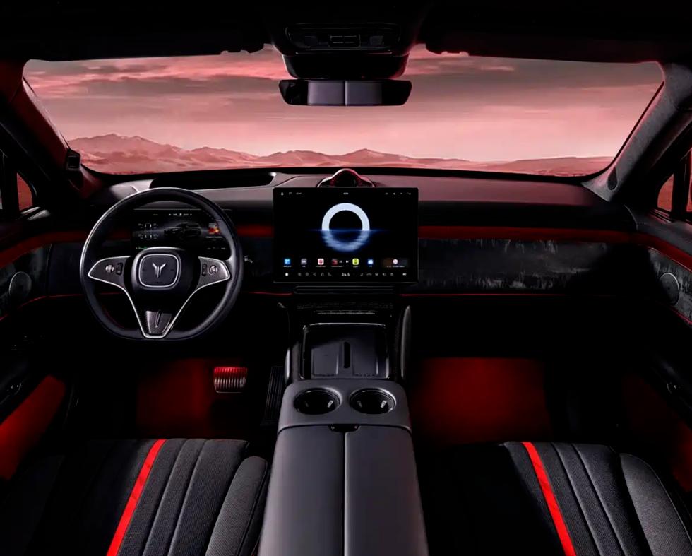 内饰中黑武士版本采用黑红配色,部分装饰面板采用碳纤维材质,中控台饰板采用流云墨韵装饰凸显个性化。内饰车顶除了21.4英寸吸顶屏外,黑武士还带来了598颗LED灯珠的星河天幕星空顶。