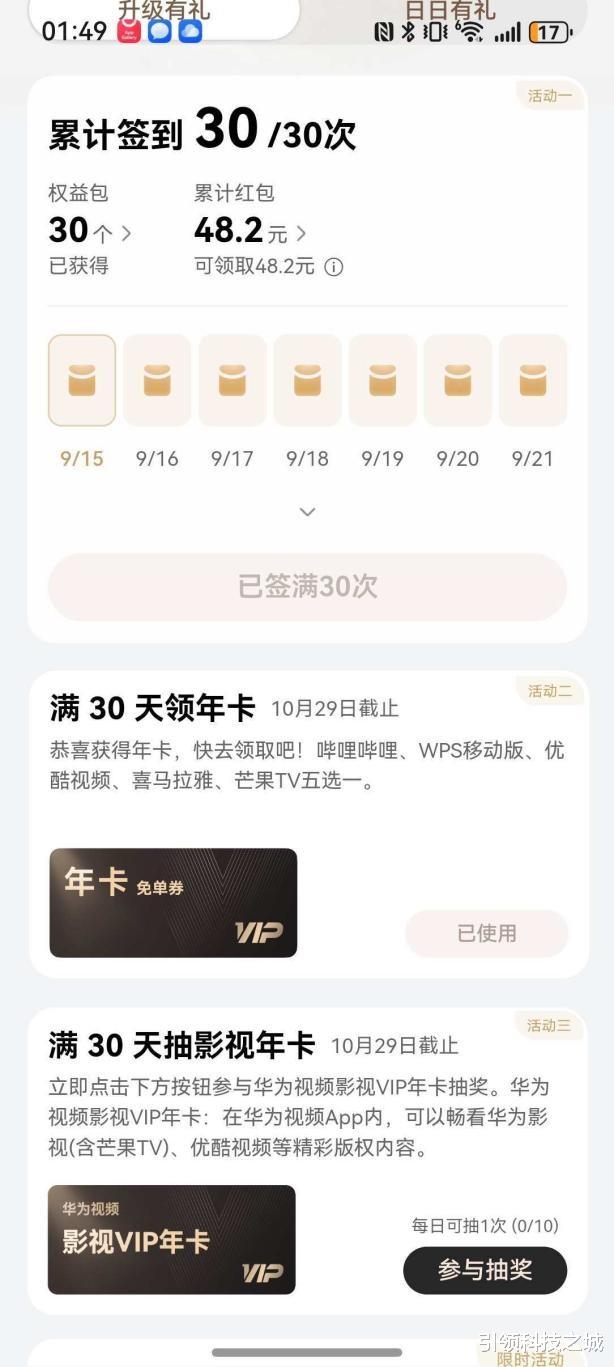 升级到鸿蒙5.1的朋友们,我不允许还有人不知道“鸿蒙有礼”这个宝藏活动,每天动动手指签到,就能领现金红包和超值福利,听歌、看书、追剧自由近在眼前。如果你已经签到满30天“毕业”了,也别以为福利跟你没关系了!赶紧滑到负一屏,再点开“鸿蒙有礼”看看,是不是还能参加抽影视VIP会员重磅活动!这细水长流的宠爱,可别错过了!