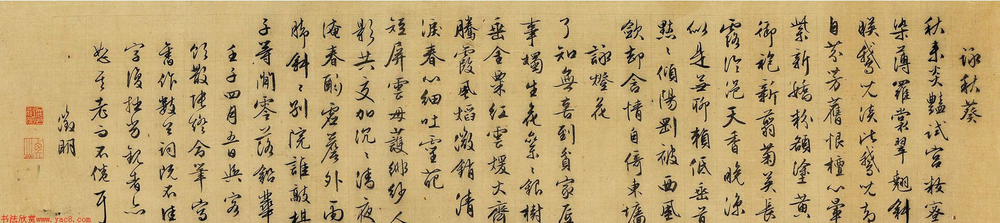 整篇行气看似平缓实则暗流涌动。每个字都在轻微摇摆:第三行的"秋"字右倾,立即用下一行"水"字左倾来平衡,这种"摇摆式前行"就像人走路时自然摆臂。另外字组间的粘合剂—牵丝引带也很有讲究,比如"何处"二字间的游丝细若琴弦,既不能断也不能粗,要在笔尖将离纸面的0.1秒完成调锋。