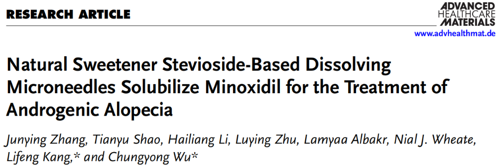 [1]ZHANG J, SHAO T, LI H, et al. Natural sweetener stevioside-based dissolving microneedles solubilize minoxidil for the treatment of androgenic alopecia[J]. Adv Healthc Mater, 2025 Oct 7:e03575. DOI: 10.1002/adhm.202503575.