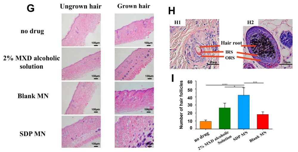 更关键的是,酒精溶液组会因乙醇蒸发导致药物在皮肤表面结晶,即便总渗透量略高,真正留在皮肤内(到达毛囊)的药物却很少;而SDPMN能让药物直接在皮肤内释放,避免了“药物浪费”和“表面刺激”的问题,也就是说,即便SDPMN的药物载量低于酒精溶液,实际作用于毛囊的药物量反而更高。