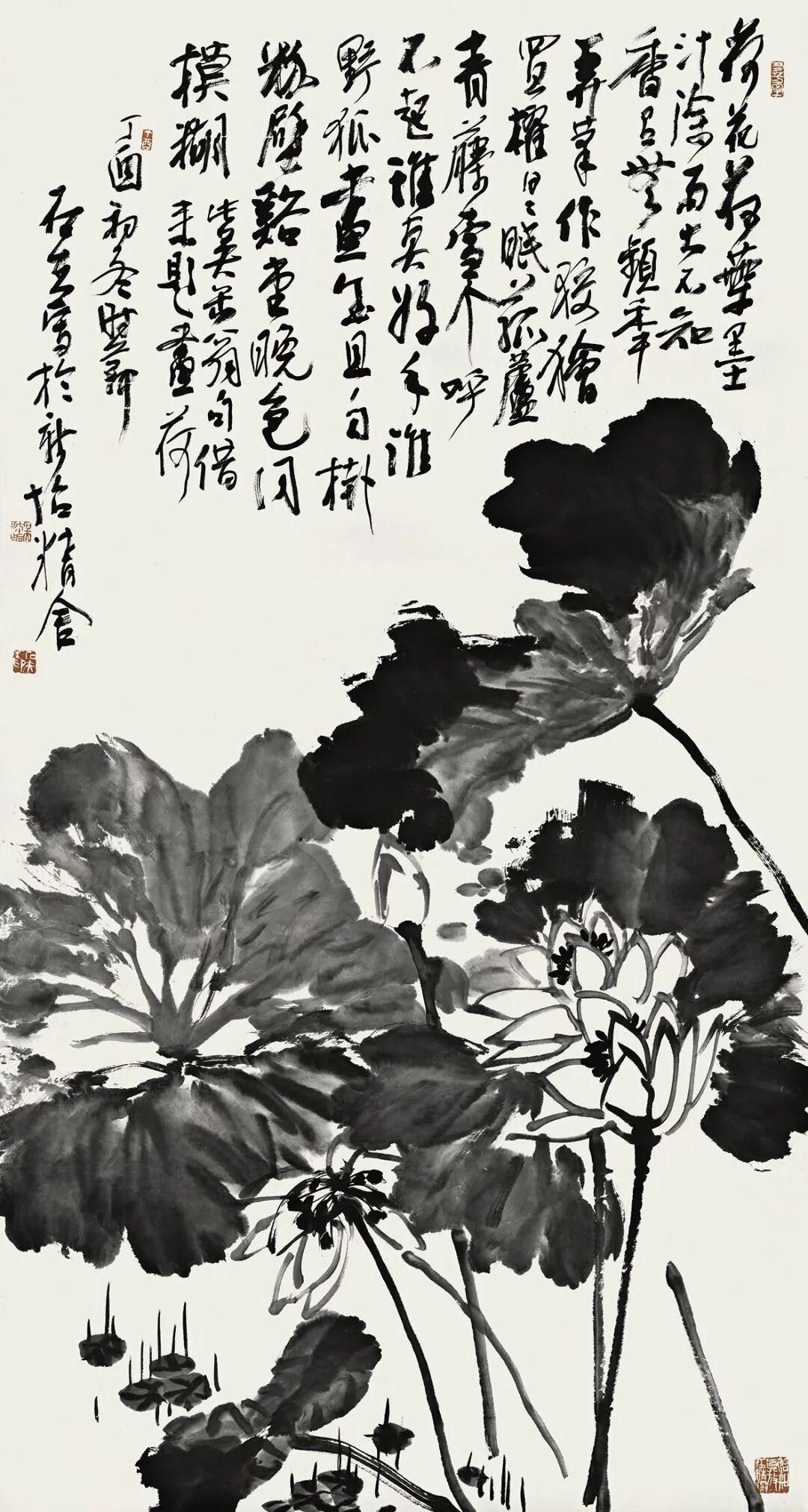 先生之大写意花鸟,深植传统正脉,直承青藤、白阳、八大之逸韵,继吴昌硕、齐白石、潘天寿之精髓,尤得苦禅先生笔墨之雄魂,于古法中深得写意之真谛。其用笔以书法入画,中锋立骨,篆隶笔意融于毫端,线条厚重老辣、笔笔见力,力透纸背,无一笔虚浮。绘梅枝则虬曲苍劲,藏金石之味;写藤萝则蜿蜒盘旋,具草书之姿;画荷杆则挺拔劲直,彰君子之骨,勾勒点染,皆循法度,于挥洒间见谨严,于率真中藏斟酌。其用墨尤见功力,泼墨、积墨诸法随心而用,浓淡干湿相生相济,焦墨写干,浓墨点叶,淡墨铺韵,飞白见骨,墨色层次万千,浑融通透,如《藤花图》以焦墨枯笔写老藤,淡紫点花,墨彩相融,苍润相间,于简淡中见生机,于厚重中藏灵秀。