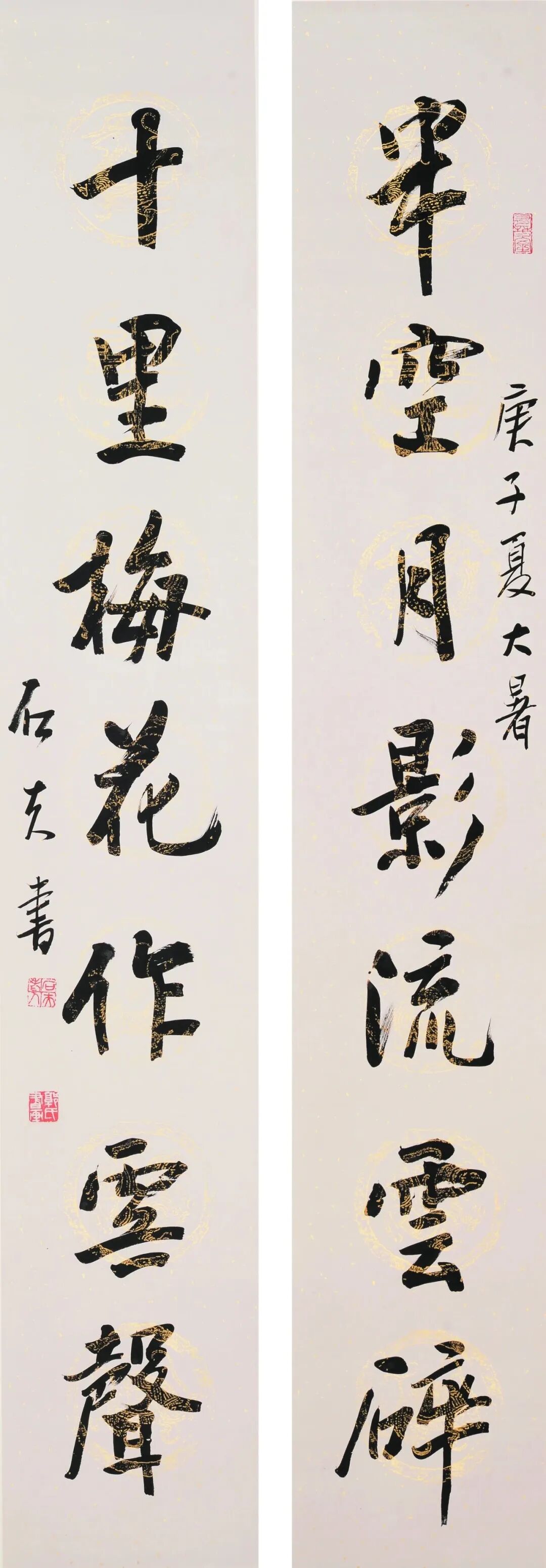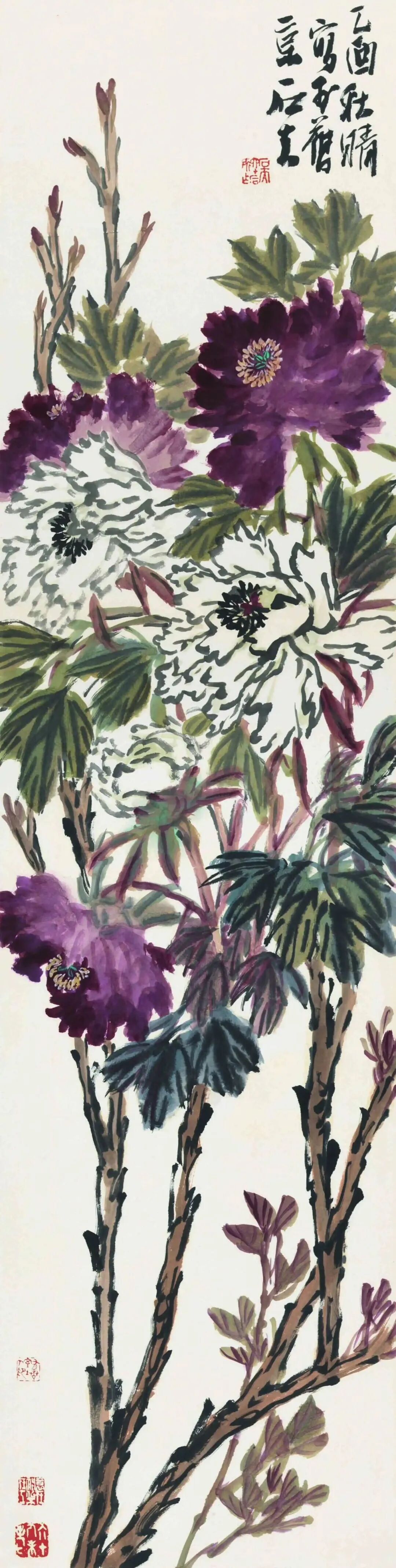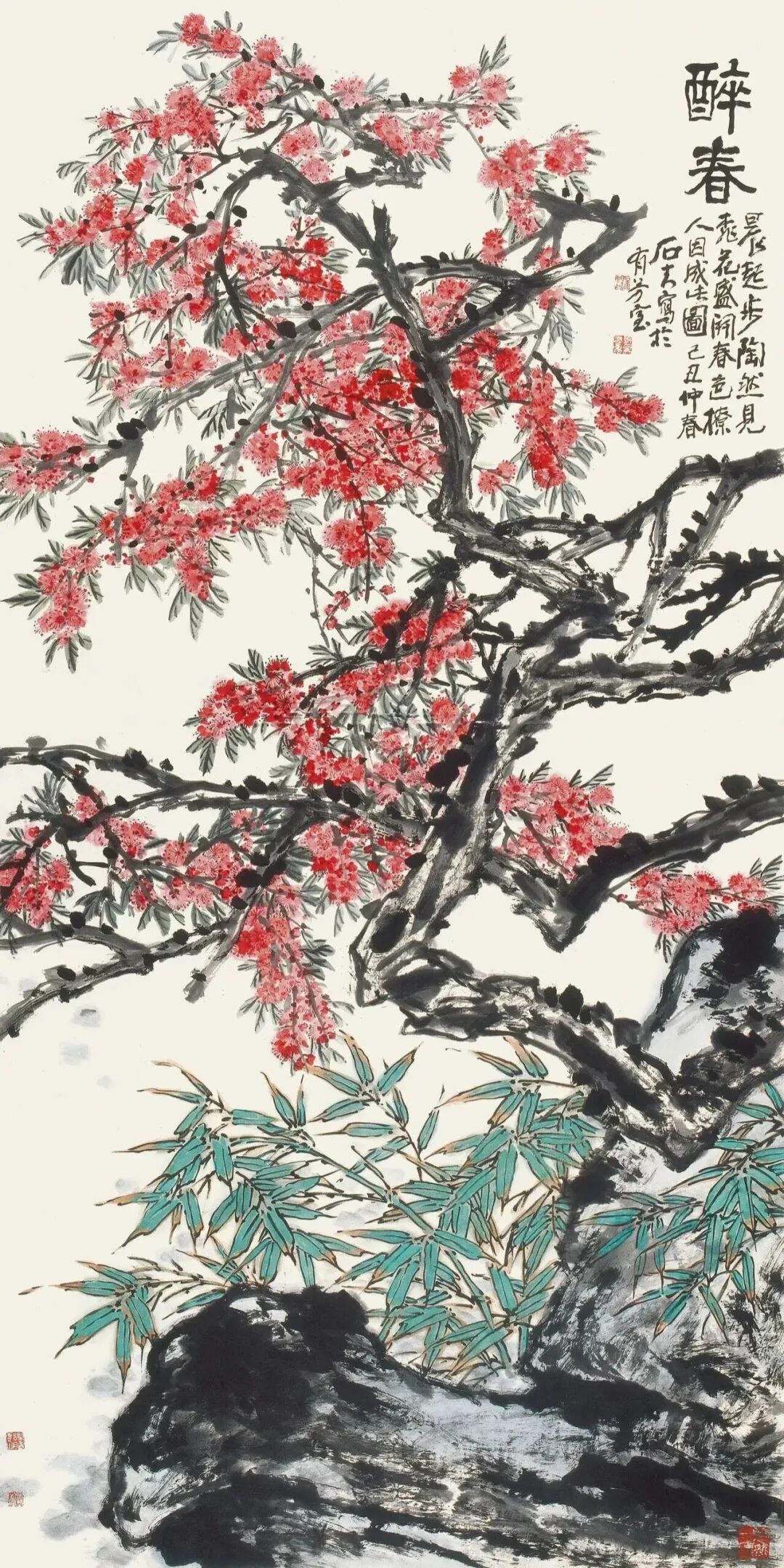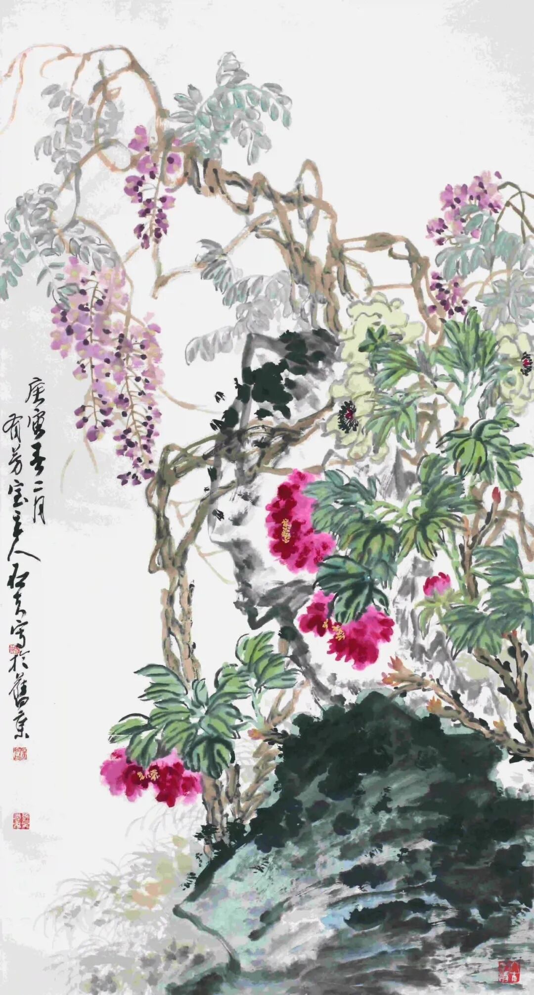 先生治艺,守传统而不泥古,承古法而善出新,于雄强笔墨中开个人之境,成独树一帜之风格。其一在融诸艺于花鸟,将戏曲之程式节奏、舞台布局之韵化入构图,篆刻之刚劲、诗词之意蕴融于笔墨,画面章法严谨,大起大落,疏可走马,密不透风,主体物象顶天立地,气势磅礴,留白处意蕴悠长,于开合之间见气韵,于虚实之中藏天趣,大幅作品意境开阔,笔墨浑融,具吞云吐月之概;小品意韵简远,笔精墨妙,如品清茗,余味悠长。其二在融时代之趣于传统,写梅兰竹菊、荷花紫藤等寻常题材,却以主体之激情与审美,赋予物象鲜明之时代印记,笔下花木禽鸟,皆朝气勃发,一扫柔媚琐碎之气,直追汉唐雄风,彰刚健向上之精神,让传统大写意花鸟于当代焕新彩。其三在色墨相融,古雅天成,承海派设色之妙,以石青、石绿、赭石等传统矿物色入画,设色明快而不艳俗,沉稳而不凝滞,墨为主,彩为辅,墨彩相融,相得益彰,于古朴中透出雅致,于雄浑中藏秀润。