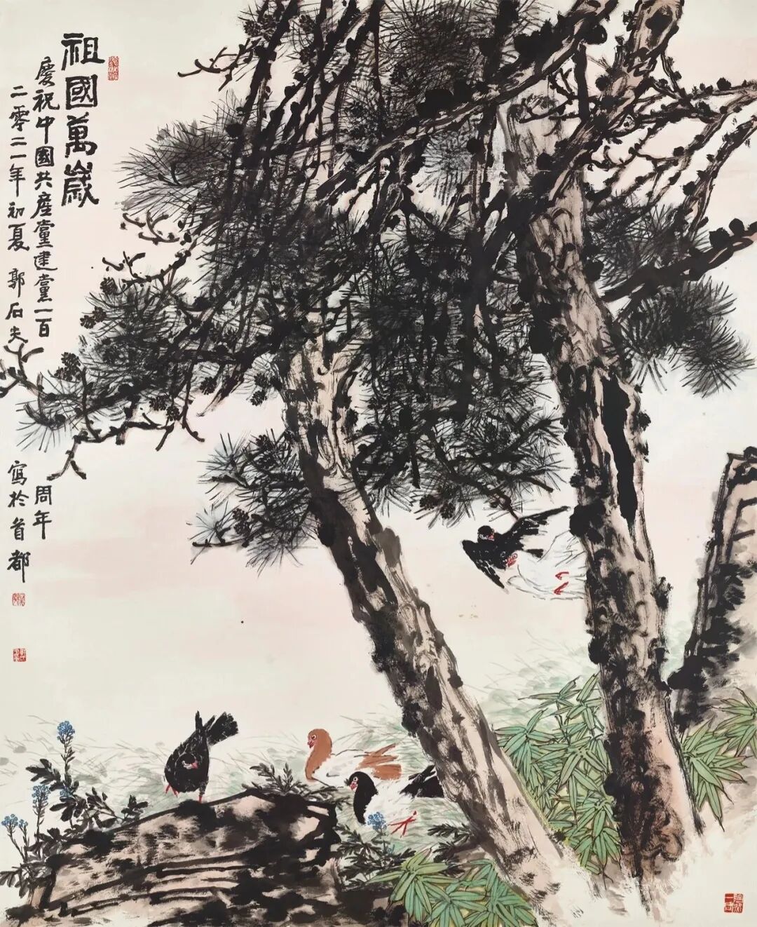 郭石夫先生,燕赵之士,一九四五年生于京华,祖籍津门,当代大写意花鸟画之巨擘也。幼承外祖母庭训习花鸟,后拜李苦禅先生为师,浸淫传统,博采众长,融书法、篆刻、戏曲之韵于笔墨,画风沉雄朴厚、古雅刚正,笔力雄强,墨韵苍润,于一花一叶、一禽一石间尽彰中国气派,为当代大写意画坛立典范。