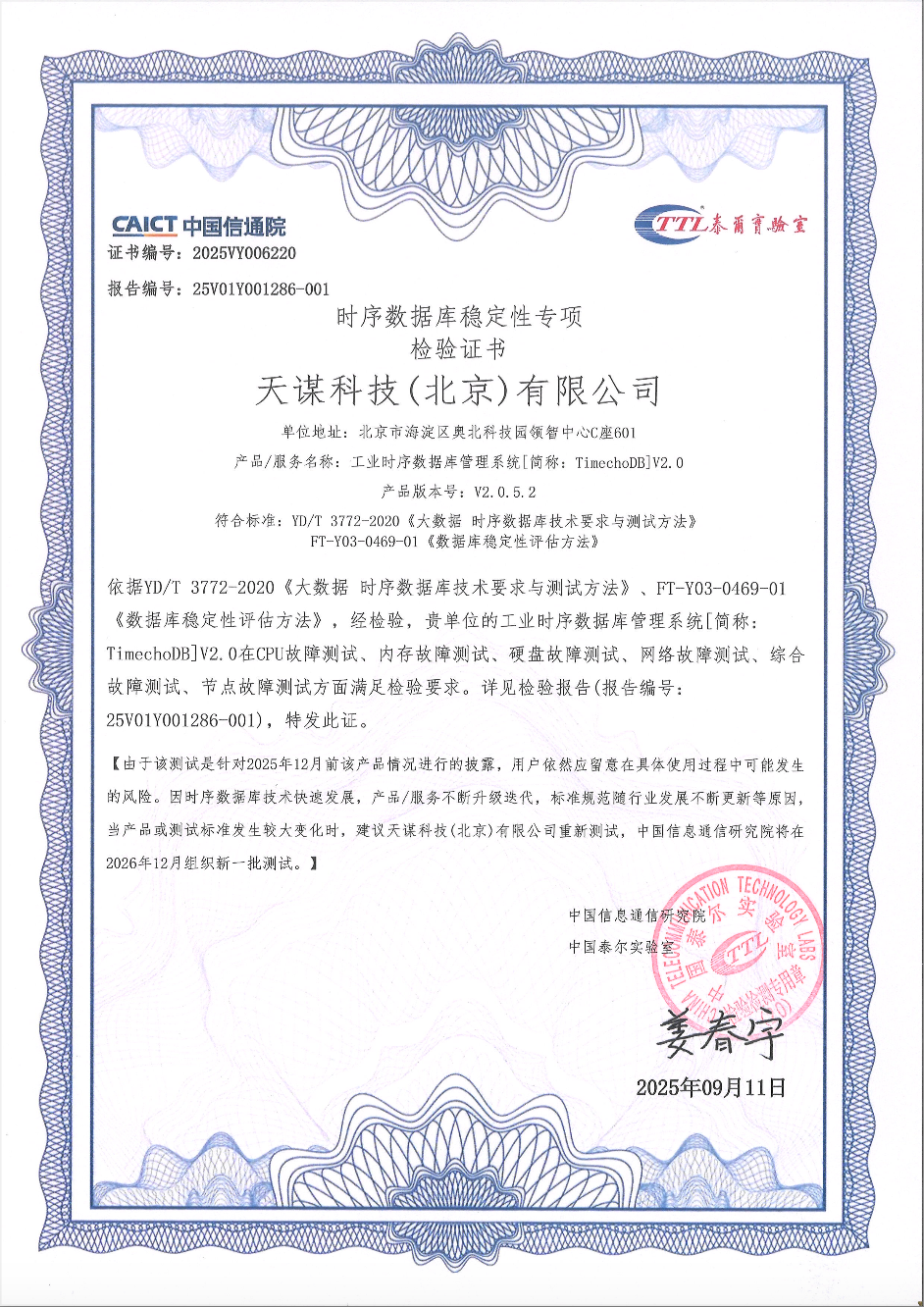 国产化/信创资质证明天谋科技及其核心产品TimechoDB在国产化与信创体系中,已通过多项政府机构及权威第三方测评机构的专业评测,具备清晰、可核验的资质认证与应用能力。该产品源于清华大学主导的国家科研成果转化,核心代码、系统架构与关键算法均由国内团队自主研发,具备高度自主可控基础,相关证书材料可按主办方要求提供备查。