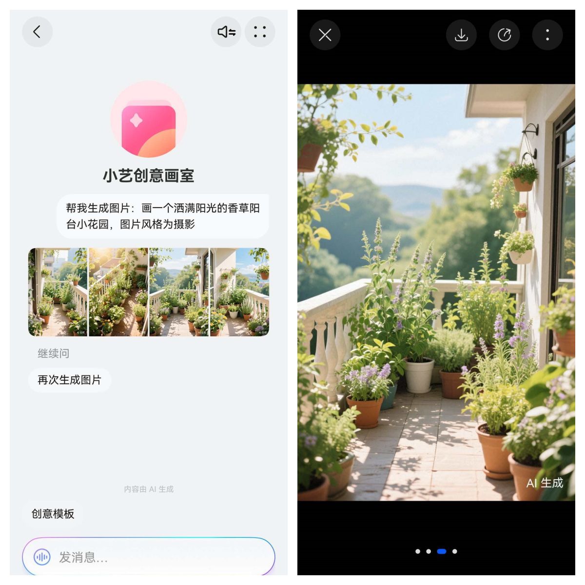 我的终极目标是打造洒满阳光的香草花园,于是言简意赅地跟小艺创意画室Agent说:“画一个洒满阳光的香草阳台小花园”,并选择了“摄影”风格。