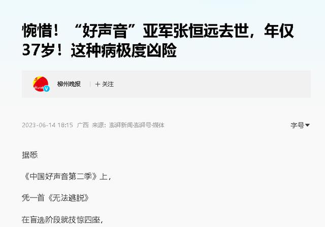 参考资料:澎湃新闻——惋惜!“好声音”亚军张恒远去世,年仅37岁!这种病极度凶险