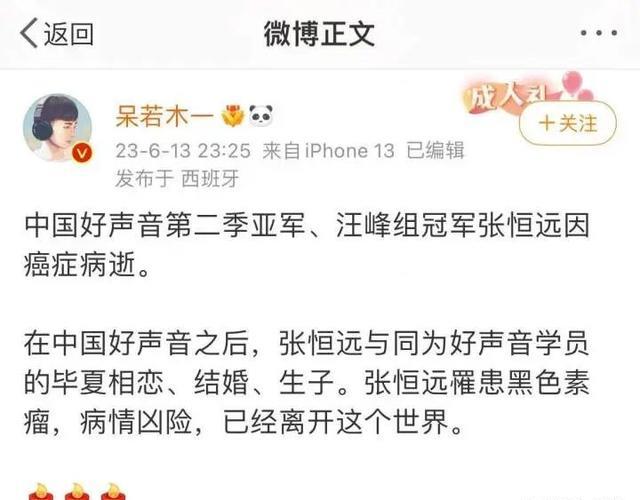参考资料:新京报——《中国好声音》及导师汪峰悼念因病去世的歌手张恒远