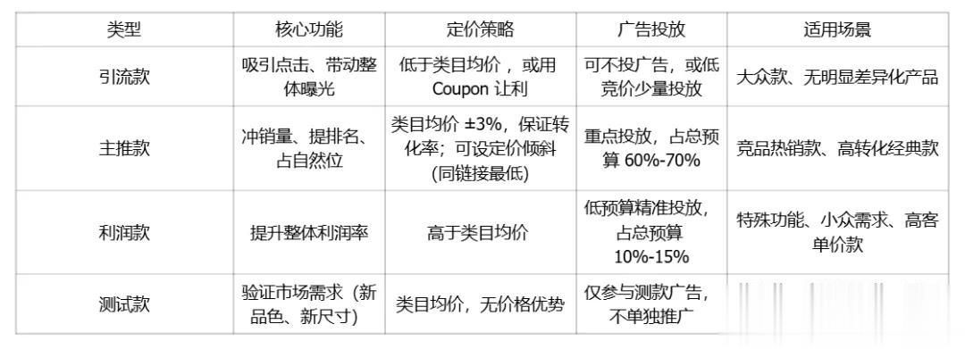 以低于市场平均价的促销或Coupon作为诱饵,承接泛流量,核心作用是拉低点击成本、提升链接整体曝光和点击率,为主推款引入访客池。