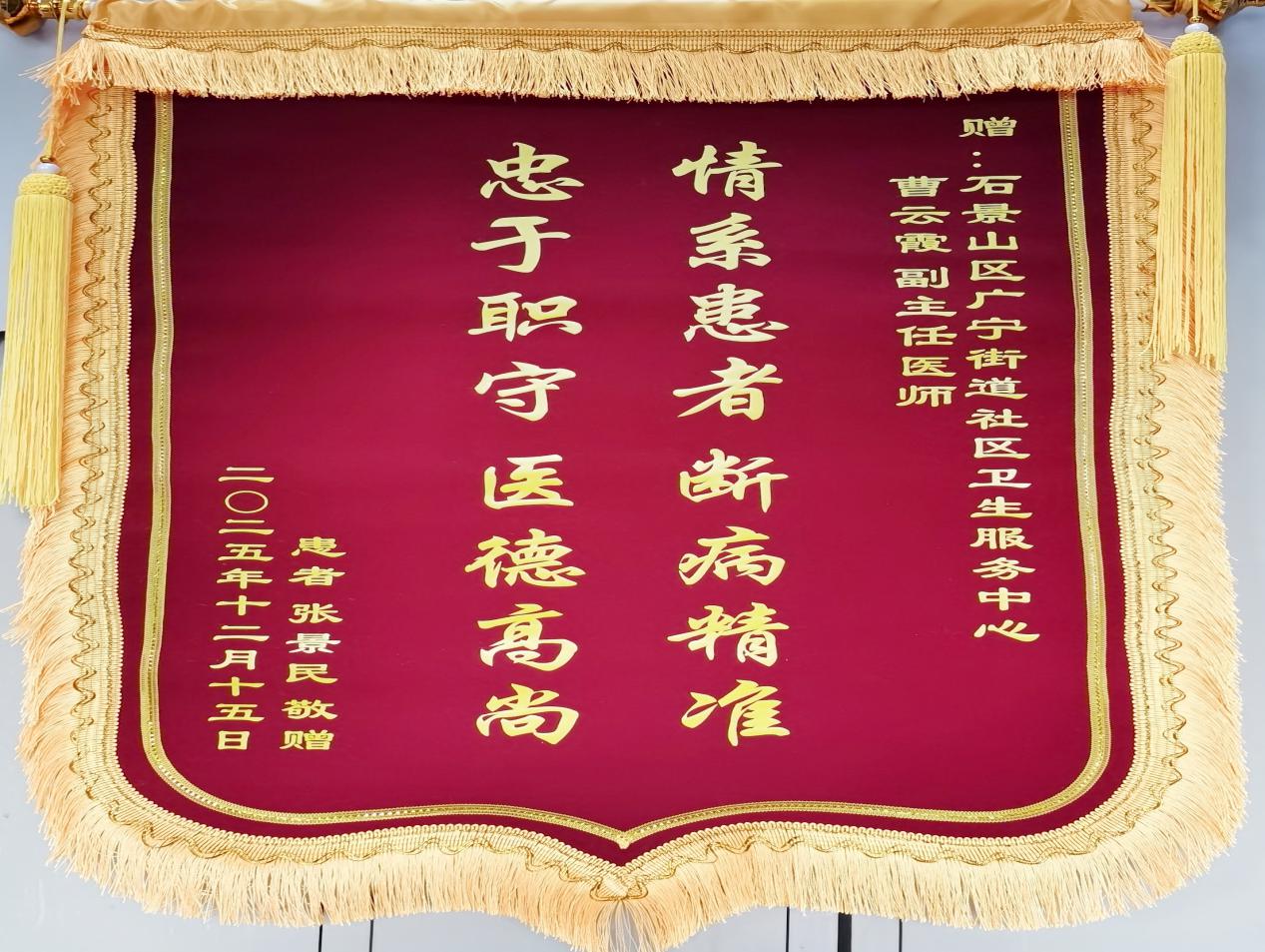 近日,广宁社区卫生服务中心全科主任曹云霞收到一面特别的锦旗。送锦旗的是一位刚就诊不久的慢性病老人,他紧握曹主任的手,满含热泪:“是您救了我一命啊!”