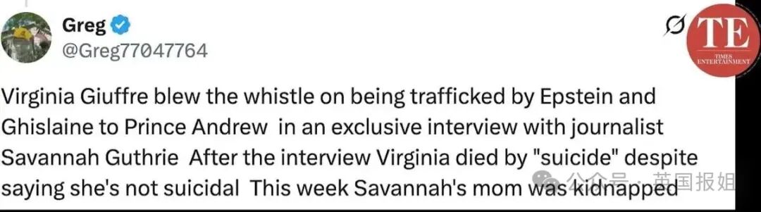 “天啊,这件事竟然几乎没有人注意到——就在最新一批爱泼斯坦文件公布后不久,那位NBC新闻主播的母亲就被绑架并被索要赎金,而这位主播在2019年曾主持对弗吉尼亚·朱弗里以及另外五名爱泼斯坦受害者的首次电视专访 。”