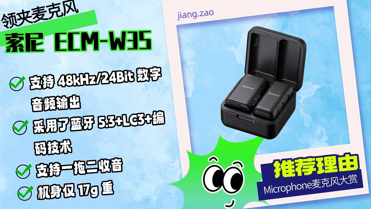 索尼 ECM-W3S 属于追求专业音质和稳定传输的高端入门款。它搭载高信噪比麦克风单元,支持 48kHz/24Bit 数字音频输出,能够精准捕捉到声音;而且它的数字降噪技术能有效滤除背景杂声,配合低切滤镜,户外风噪抑制效果出色。还采用了蓝牙 5.3+LC3+编码技术,拥有在150 米无遮挡环境下稳定传输的理想效果;支持一拖二收音,多人创作场景能轻松应对。而且机身仅 17g 重,夹戴轻便,搭配索尼生态设备能实现无缝衔接,操作更便捷。