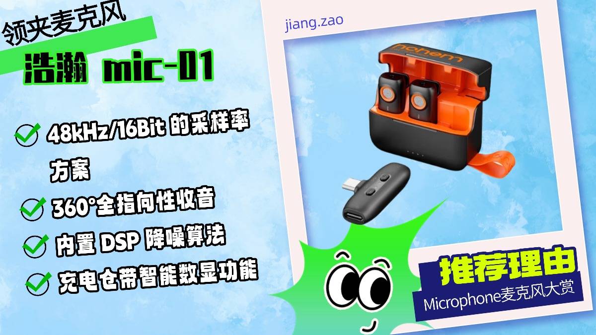 浩瀚 mic-01搭载了48kHz/16Bit 采样率方案,配合高保真拾音单元,能还原自然真实的人声质感;而且内置 DSP 降噪算法,能有效过滤室内外环境杂音,不管是室内录制还是户外拍摄,收音都干净清晰。并且它的机身采用轻量化设计,夹在衣服上几乎没什么存在感;充电仓带智能数显功能,剩余电量一目了然,不用猜来猜去担心没电。兼容性覆盖手机、相机、运动相机,即插即用,不用额外搭配转接头。