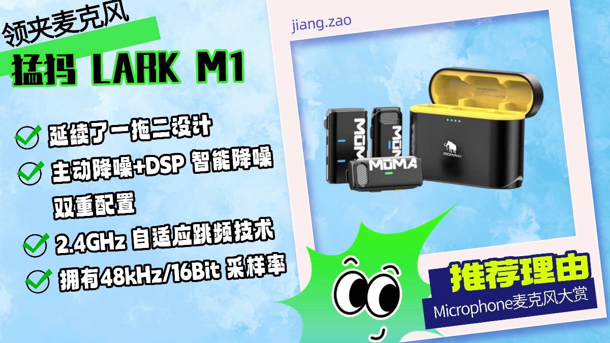 LARK M1作为猛玛入门级热门机型,它兼顾了实用性和多人适配。而且延续了一拖二设计,能同时连接两个发射器;主动降噪+DSP 智能降噪双重配置,室内外拍摄都能保持人声清晰。同时它的2.4GHz 自适应跳频技术保障了 200 米内稳定传输,几乎没有延迟和断连情况;11.8g 轻量化机身搭配稳固背夹,夹在衣物上不易移位,长时间佩戴无负担。还拥有48kHz/16Bit 采样率保障基础音质,日常创作完全够用,后期不用过多调音。