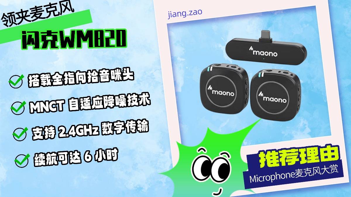 闪克 WM820 相对来说更侧重便携颜值与实用功能的入门级无线领夹麦。它搭载全指向拾音咪头与 MNCT 自适应降噪技术,信噪比达 82dB,能精准捕捉声音细节并抑制环境杂音;还支持 2.4GHz 数字传输,50 米无遮挡环境下连接稳定、延迟低,音画同步流畅。而且机身小巧轻便,仅 28g 重,夹戴无负担,开机 2 秒自动配对,还配备 6 级增益调节与耳返监听功能,操作便捷。而且续航可达 6 小时,支持边充边用,兼容手机、相机等多设备,配件齐全开箱即用,可选一拖二版本适配多人场景。