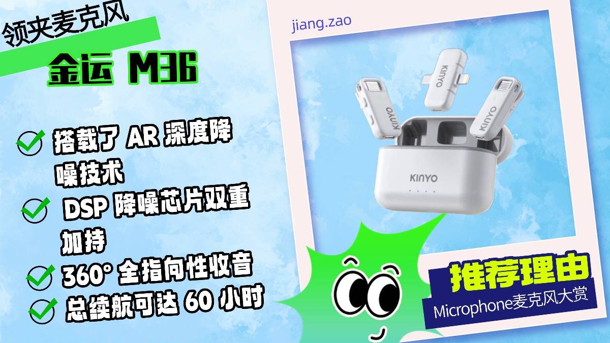 金运 M36搭载了 AR 深度降噪技术与 DSP 降噪芯片双重加持,能一定程度抑制环境杂音,提升录音纯净度;而且拥有360° 全指向性收音拾音范围宽广且定位精准,还支持立体声录音模式;同时搭配32kHz/16Bit 采样率保障基础音质,日常录语音、简单短视频完全够用。苹果和安卓双接口设计,兼容市面上大多数设备,即插即用不用额外买转接头;而且单次续航达 8 小时,搭配 800 毫安大容量充电仓,总续航可达 60 小时,不用频繁充电;操作简单易上手,新手也能快速投入创作。