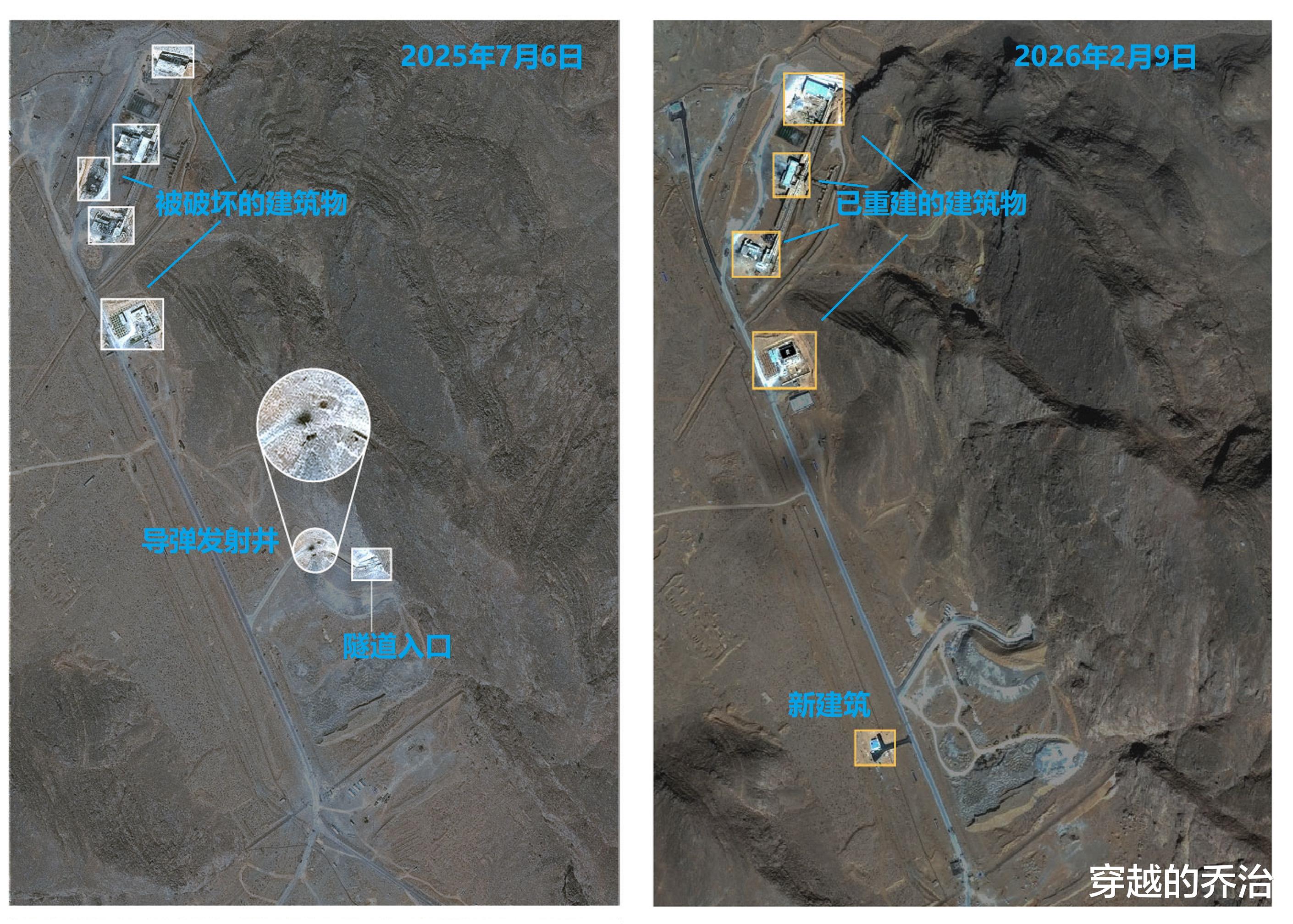 2026年2月10日的高分辨率卫星图像显示,伊朗纳坦兹Natanz附近Pickaxe山的地下综合设施的隧道入口已经重新浇筑混凝土,图片显示现场还有卡车和其他施工设备。