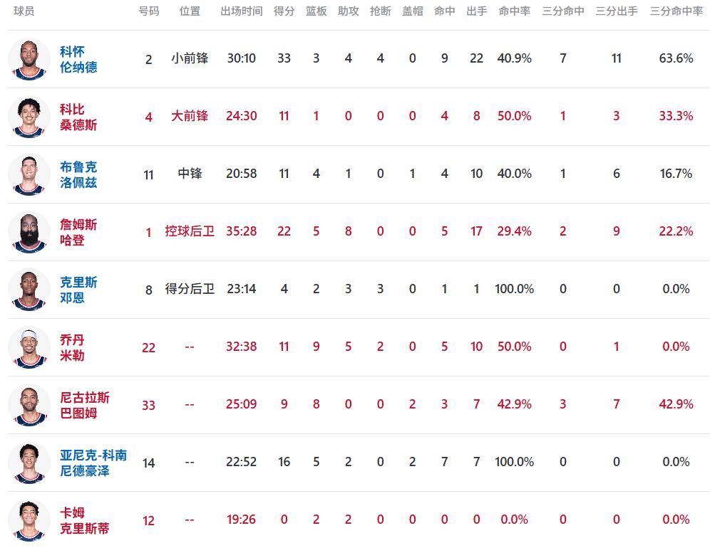 数据方面,伦纳德全场贡献33分3篮板,哈登也有22分入账,两人成为快船取胜的最大功臣。