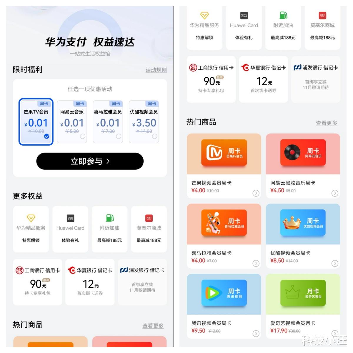 精明海淘,省钱也是关键。这次天际通的流量费,我用Huawei Pay绑定境内发行的银联卡完成线上流量套餐支付还享受了立减优惠。而且华为支付在双11期间还推出了“一站式生活权益馆”,我顺手点进去,发现活动真不少,热门视频会员周卡居然低至1分钱。果断抢了一张,正好留着回程飞机上看剧。