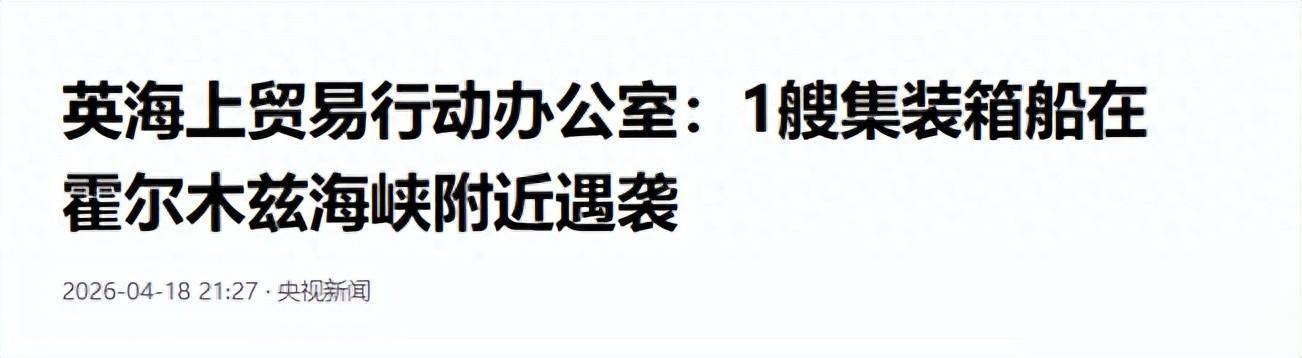 央视新闻在2026年4月18日报道称,英国海上贸易行动办公室表示,“霍尔木兹海峡附近1艘集装箱船遭不明发射物击中,部分集装箱受损,未引发火灾,也未造成环境影响”。“相关事件发生在阿曼东北约25海里处”。据称,这是一艘法国集装箱货轮,继悬挂印度国旗的油轮遭到两艘伊朗炮艇的射击后,一艘法国集装箱船报告称,遭到伊朗的自杀式无人机撞击,但未造成重大损失,而另一艘油轮报告称附近有不明物体落入水中,据称可能遭到了反舰导弹打击。