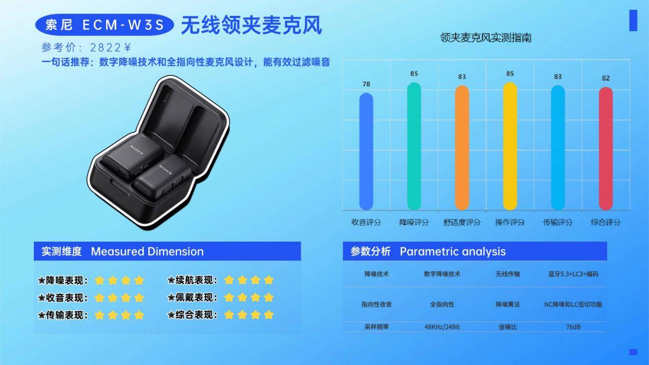 索尼ECM-W3S是一款适合日常使用和短期创作需求的无线麦克风。它的音质表现、蓝牙传输稳定性和轻便设计使其成为中高端市场中的不错选择。尽管它的降噪性能在嘈杂环境下有所不足,续航也适合日常使用,但对于需要长时间录制或高要求降噪的用户,可能需要寻找更专业的设备。对于大多数日常创作者来说,ECM-W3S仍然是一款性价比高、便捷实用的无线麦克风。