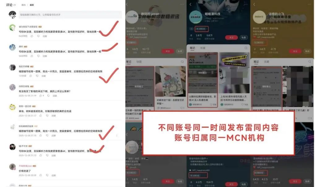 前两天还在讨论参数、价格和使用场景的用户,开始被另一种声音覆盖——它们遍布在不同的帖子评论区,但内容却如出一辙,有时候,甚至是同一句话。舆情监测合作方告诉李梓宁,“这些内容是突然爆发的,多数账号来自同一家MCN机构。”
