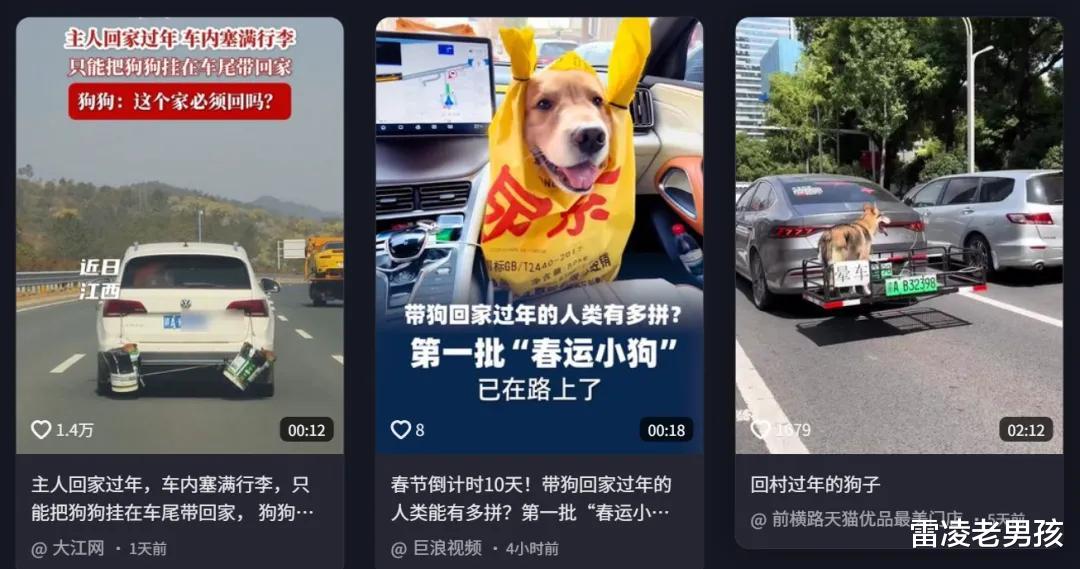 在一片返乡的洪流中,在那些高速流动的私家车尾部,都挂着几个塑料桶、编织袋、甚至是简易的木质托架,里面无一例外塞着一只眼神迷茫的“春运小狗”。