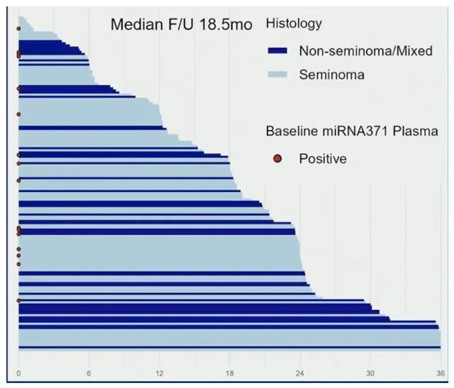 血浆检测性能显著优于血清,基线标志物阳性者复发风险激增10倍且现有病理指标全面落败?CLIMATE研究的中期分析结果展现了miR-371a-3p作为微小残留病标志物的显著临床价值。在196例可评估患者中,中位年龄33岁(范围22-78岁),组织学类型分布为纯精原细胞瘤117例(60%)与非精原细胞瘤79例(40%)。中位随访18.9个月期间,共观察到40例(20%)复发,中位复发时间为4.2个月(范围1.1-17.7个月)。值得注意的是,实际复发时间较历史预期明显缩短:精原细胞瘤中位复发6.7个月(传统预期14-15个月),非精原细胞瘤中位复发4.0个月(传统预期5-6个月),这一发现可能反映了现代影像学早期检出能力的提升,也可能暗示了纳入人群的真实高危特征。
