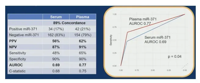 在样本基质比较方面,血浆检测展现出明确优势。基线血浆miR-371可检测率为21%(42/196),血清为17%(34/196)。受试者工作特征曲线(ROC)分析显示,血浆检测的曲线下面积(Area Under Curve, AUC)为0.77,显著优于血清的0.69,因此后续分析均基于血浆数据,报告如下: