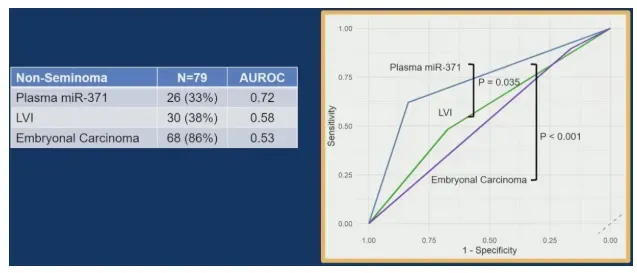 在非精原细胞瘤亚组(30例复发,中位随访20.8个月),miR-371的AUC为0.73,显著优于淋巴血管侵犯(AUC 0.58,p=0.035)及胚胎性癌成分(AUC 0.53,p<0.001)。