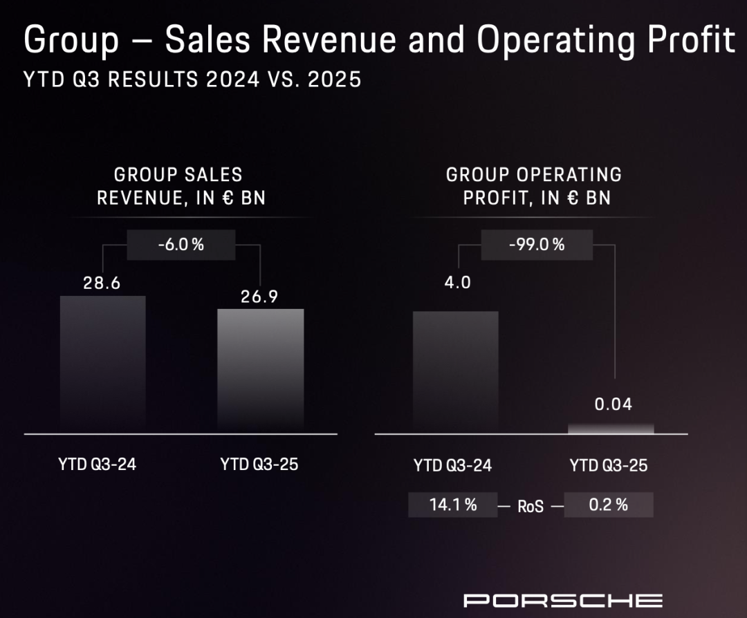 最新的第三季度财报显示,今年1-9月,保时捷的营业利润从去年同期的40.35亿欧元暴跌至4000万欧元,同比狂降99%。
