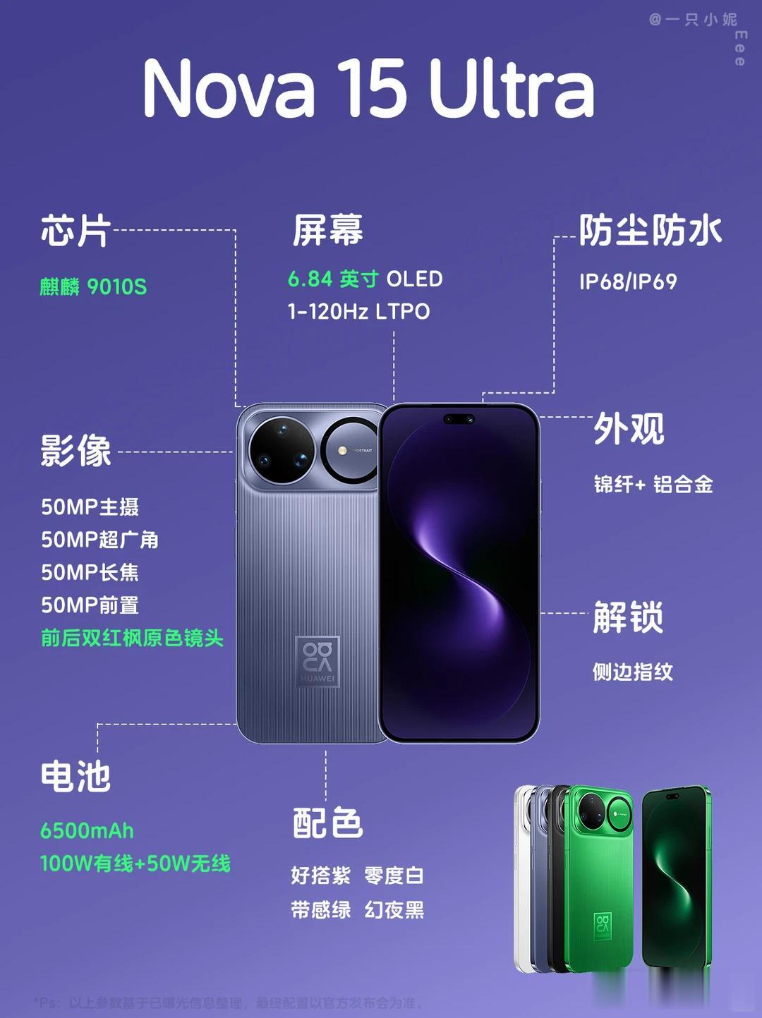 另外一点,nova15Ultra的防尘防水等级从IP65提升到旗舰机级别的IP68/IP69,还有双卫星通信,在100W快充的基础上也加了50W无线快充。这些细节一拉满我们就可以看出,这nova15Ultra就是一款次旗舰,在nova15Pro的基础上,把影像和一些外围配置,能拉的都拉满了(当然,价格也是十分接近旗舰机了)。