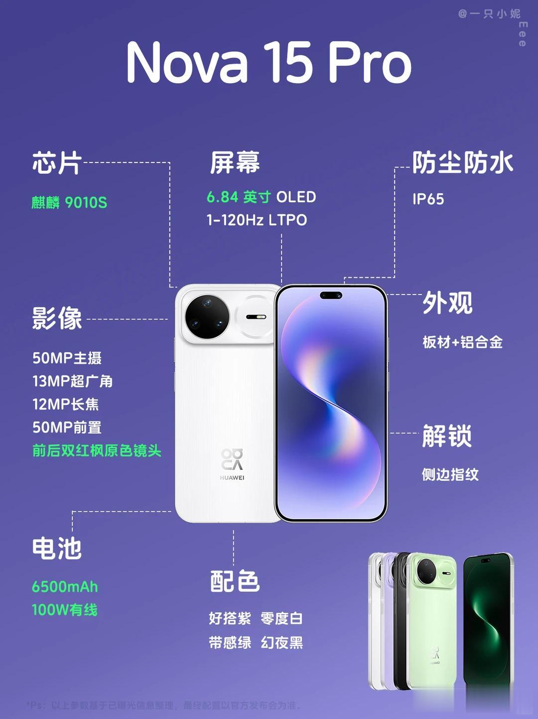 nova15:麒麟8020处理器+12G运存,6.7英寸直屏,分辨率:FHD+(2412 × 1084),支持2160Hz高频PWM调光,395 PPI。