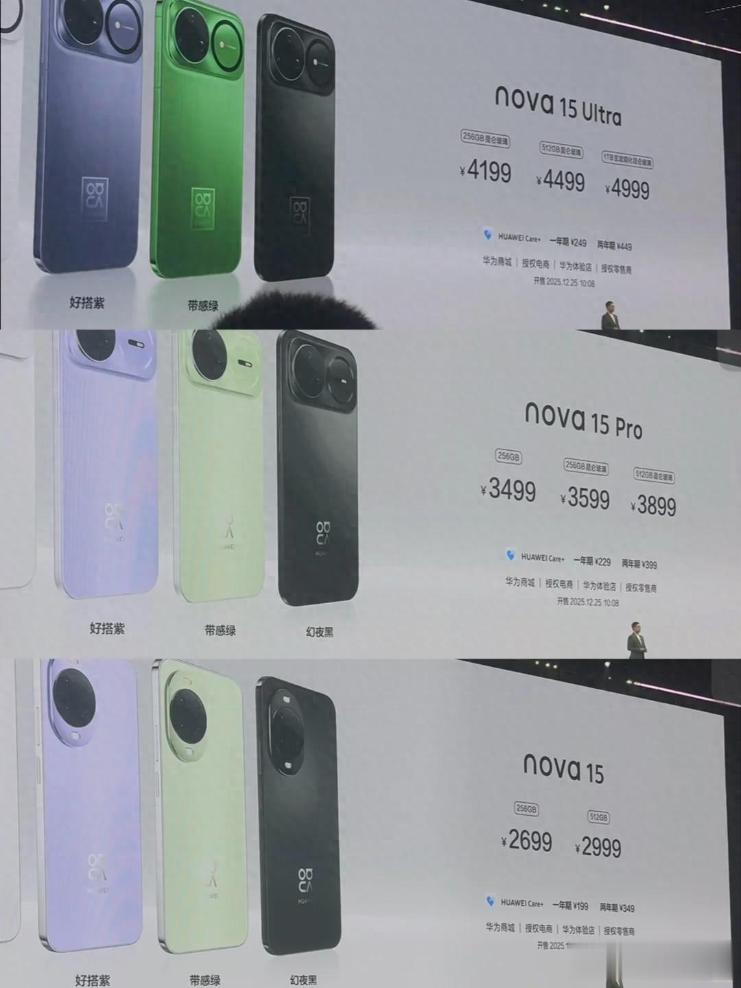 我们先看价格:nova15:256GB 2699¥、512GB 2999¥nova15 Pro:256GB 3499¥、256GB昆仑玻璃 3599¥、512GB昆仑玻璃 3899¥nova 15 Ultra:256GB 4199¥、512GB 4499¥、1TB 4999¥