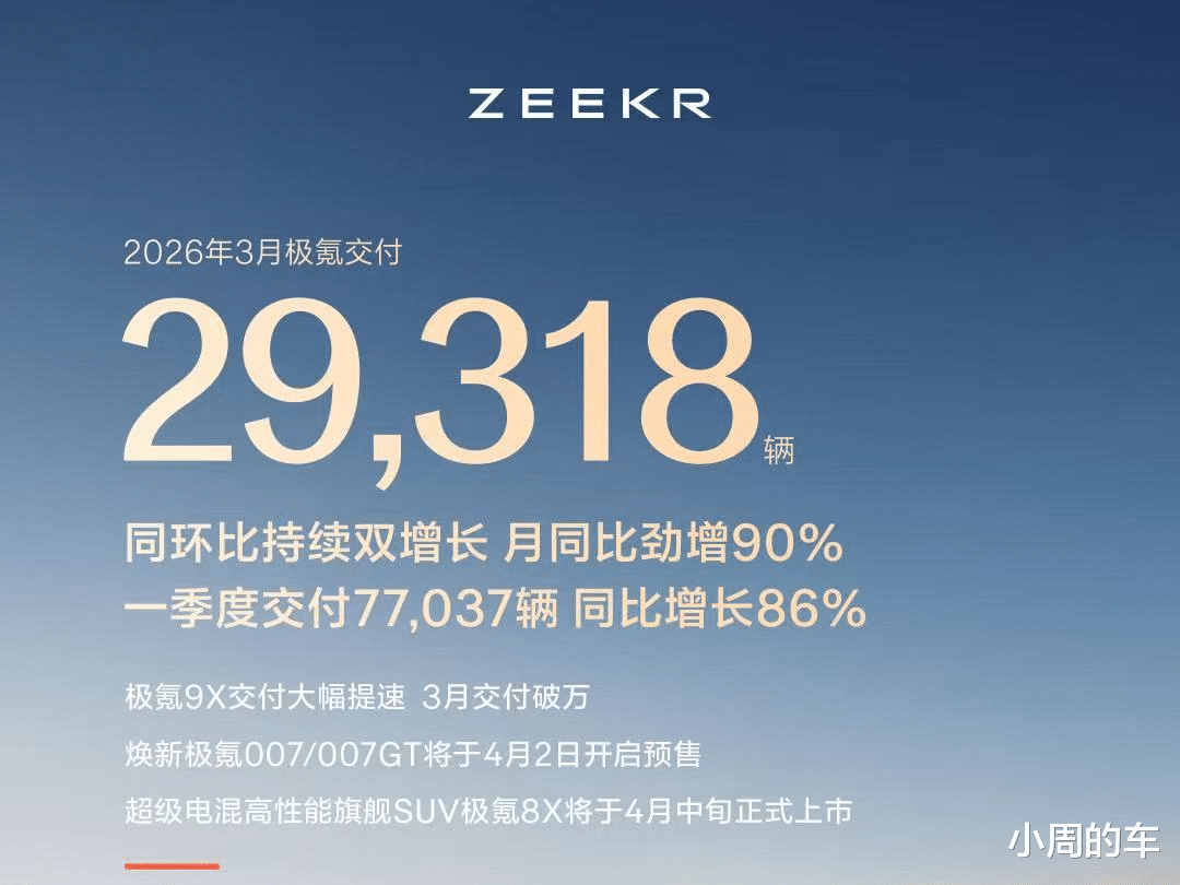 极氪汽车3月份交付了新车29318辆,同比增长90%,环比增幅为23%,一季度极氪汽车累计交付量为77037辆,同比增长了86%。